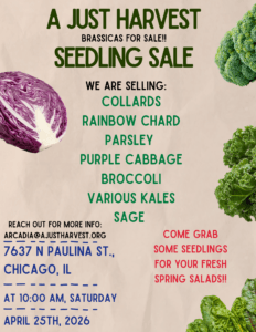 Saturday, April 25 at 10am – A Just Harvest Seedling Sale!! Grab your seedlings for your fresh spring salads or starting up your own garden!